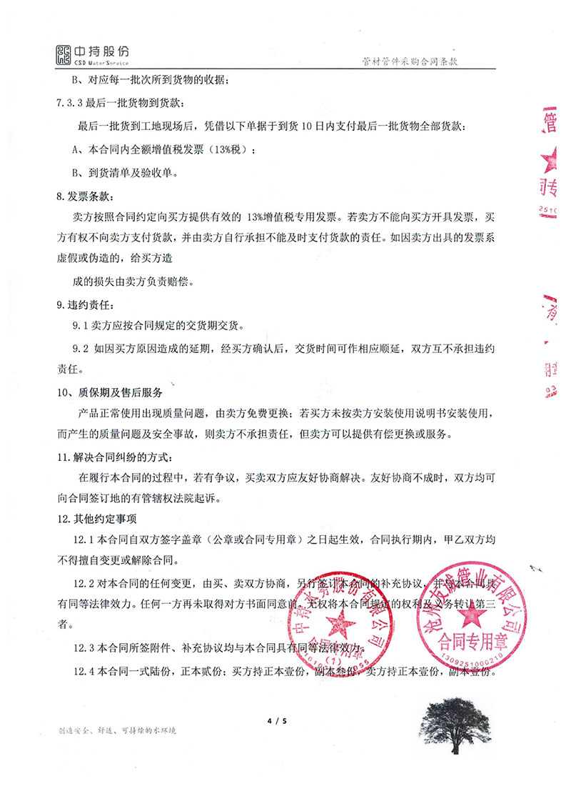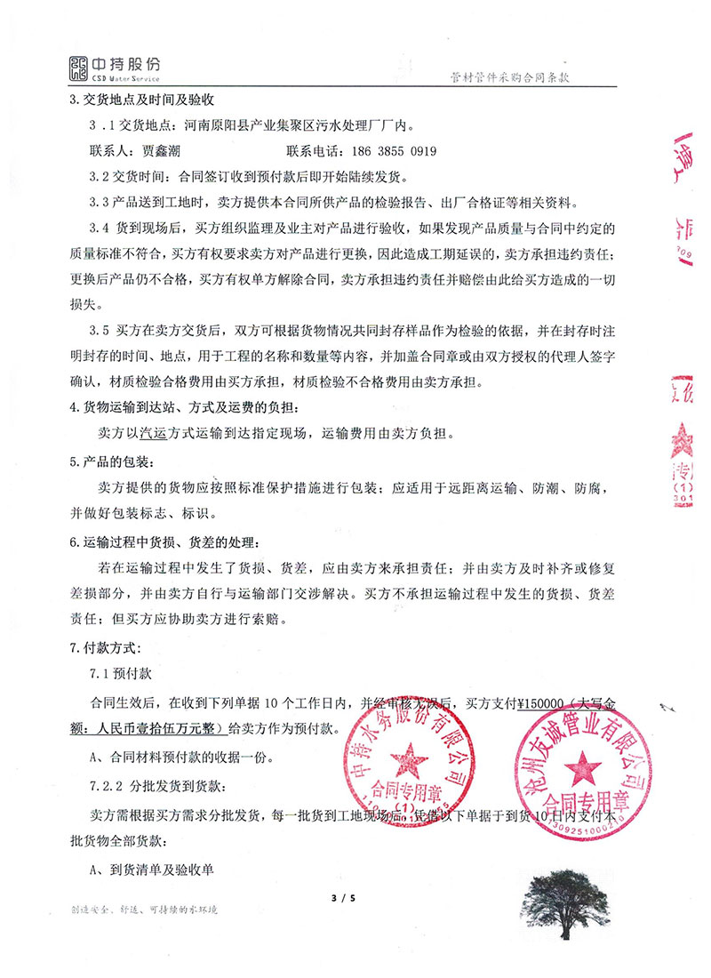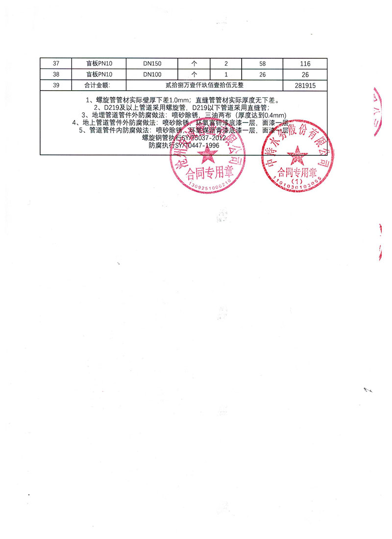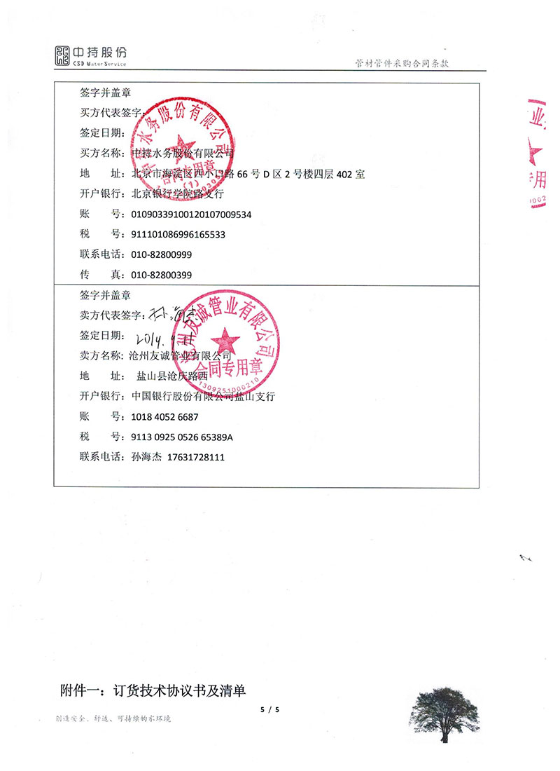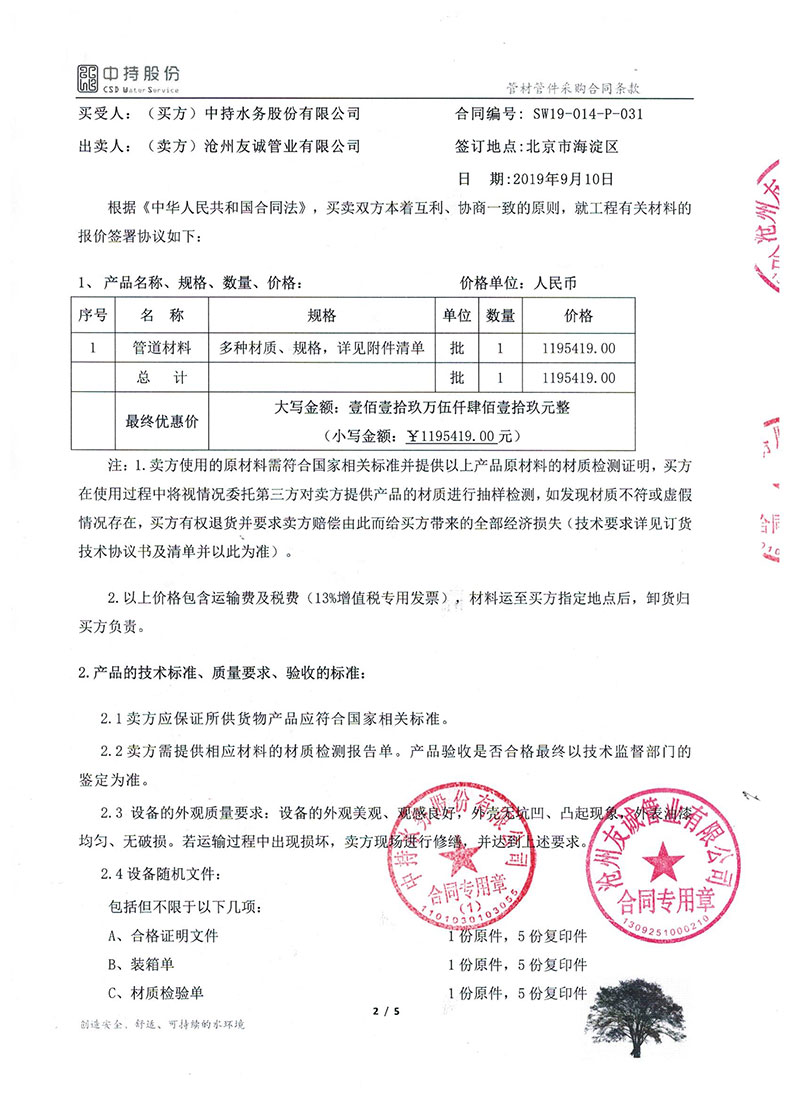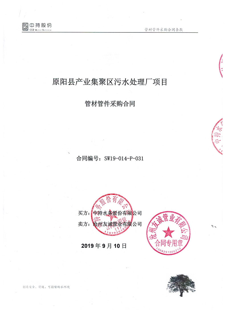 2019年9月份,友誠管業與中持水務股份有限公司(上市公司),簽訂了原陽縣污水處理廠項目的防腐螺旋鋼管合同,非常感謝貴公司對我們的信任,我們也一如即讓的做好每一支鋼管